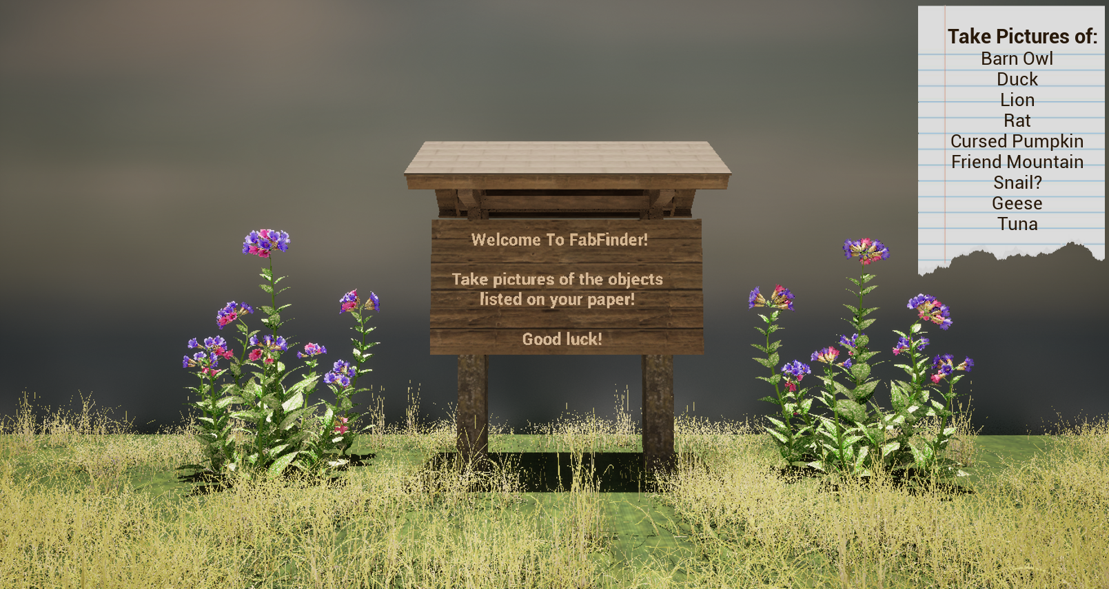 FabFinder is a picture taking game akin to an I-Spy book. The player will explore a fractured world while taking pictures of notable anomalies.